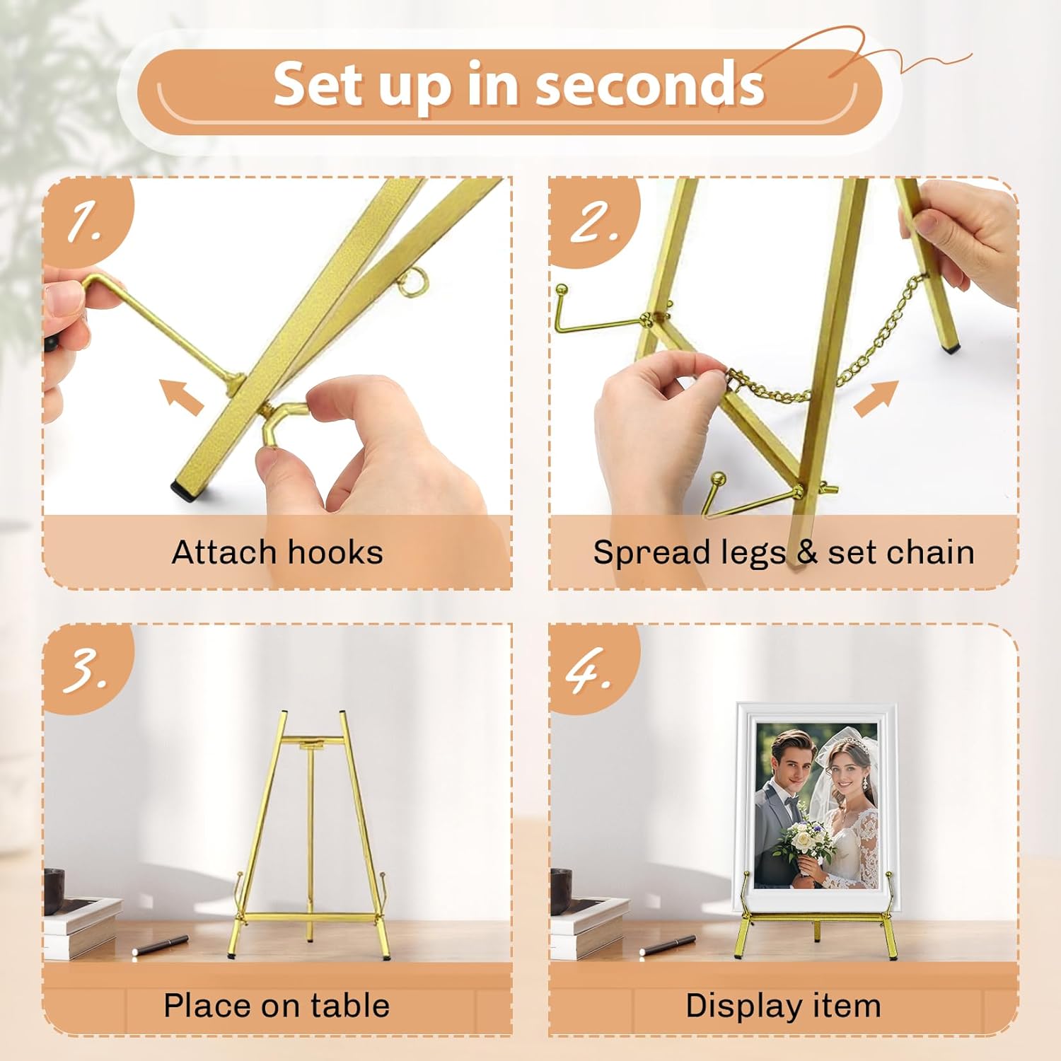 BeeCoAoo 16.5″ Metal Easel Stand for Sign u2013 Elegant Table Top Easel for Display, Heavy Duty Tabletop Picture Easel Stand for Wedding Sign, Picture Frame, and Art (Gold)