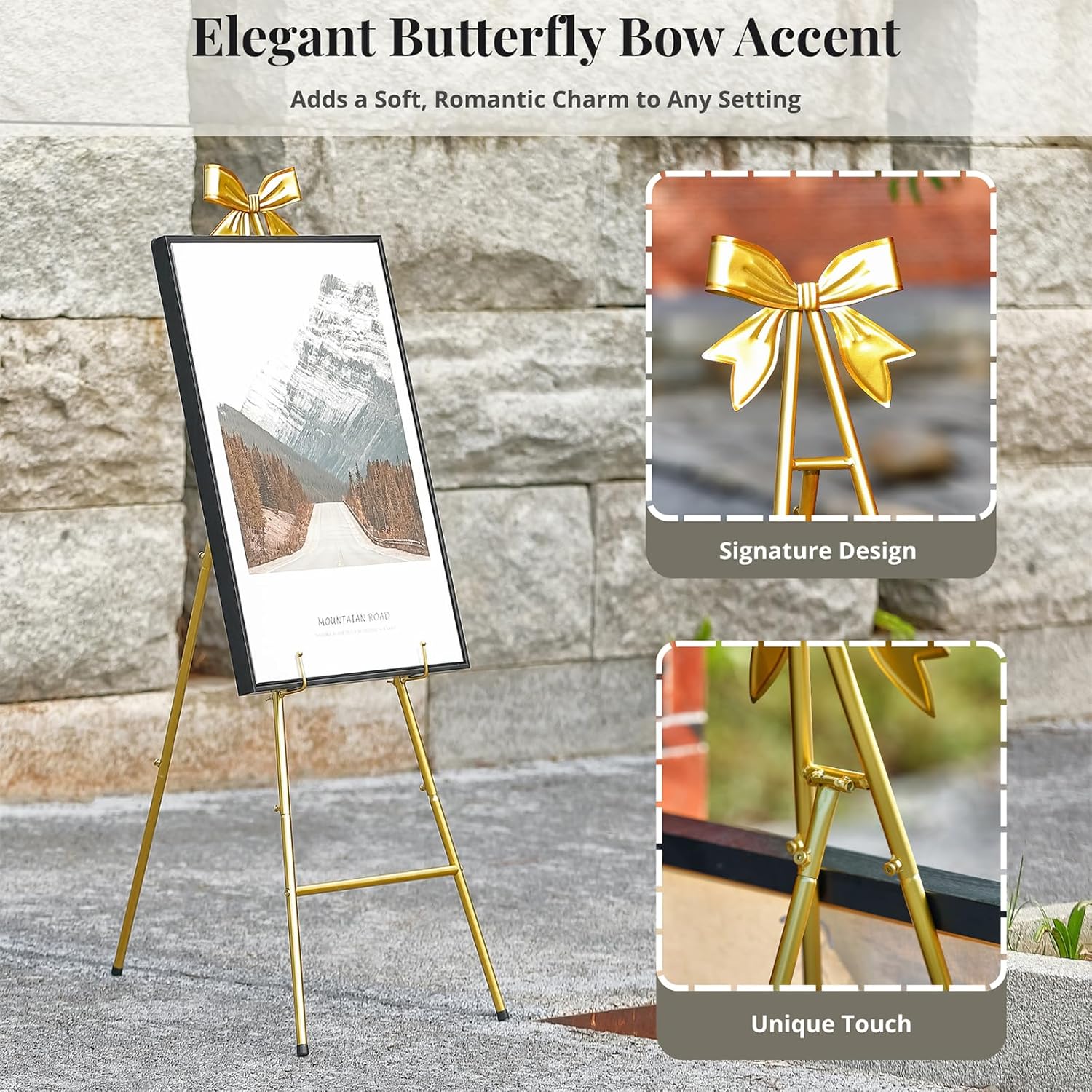 CaliDecor 53u201DH Metal Gold Easel Stand for Sign, Large Adjustable Display Standing with Butterfly Bow Top for Wedding Displaying Pictures Poster Holder Showcasing
